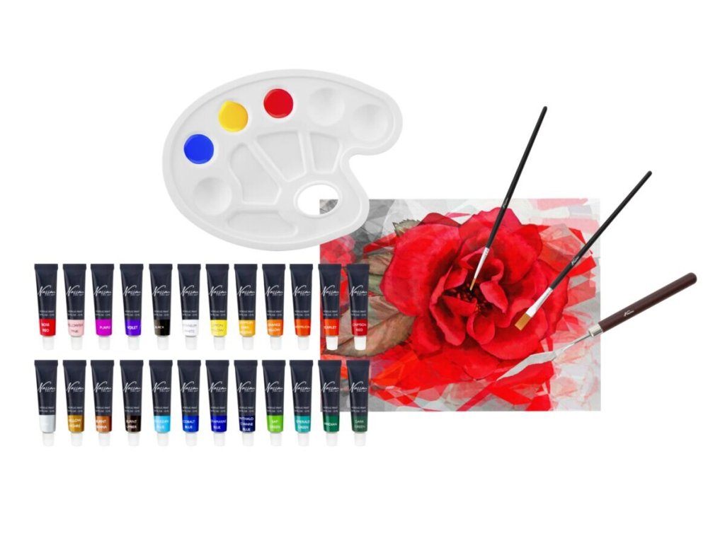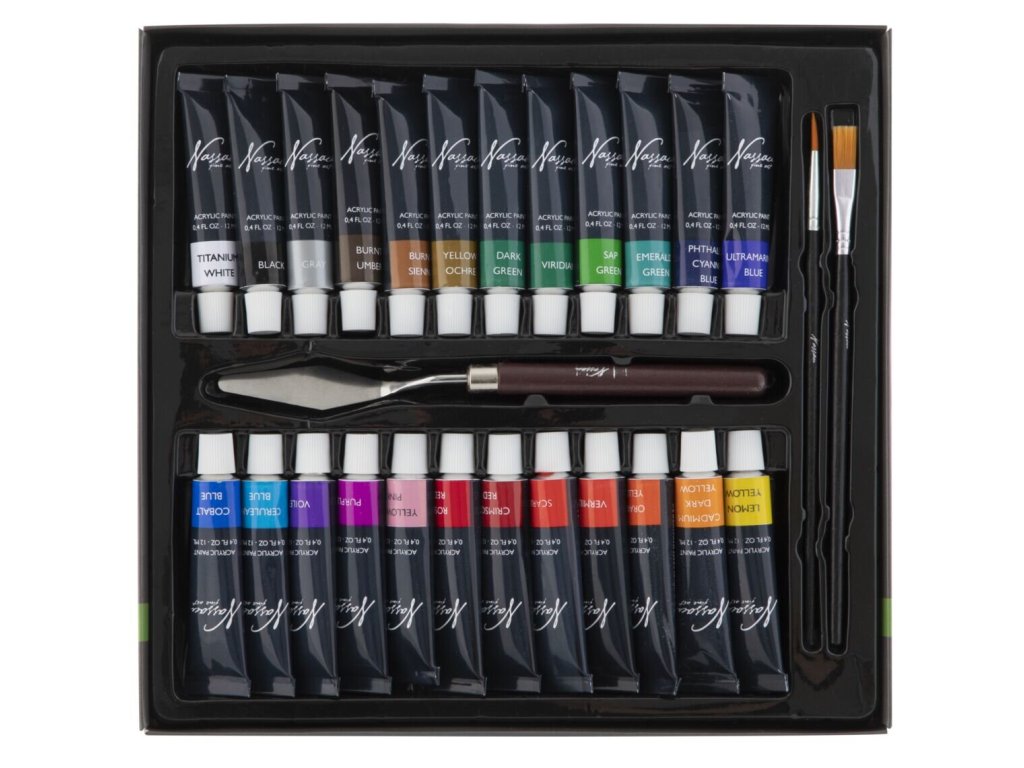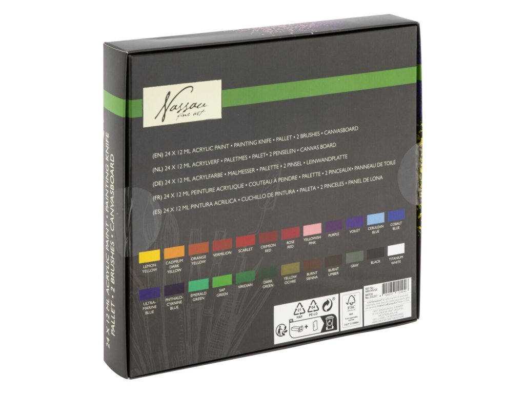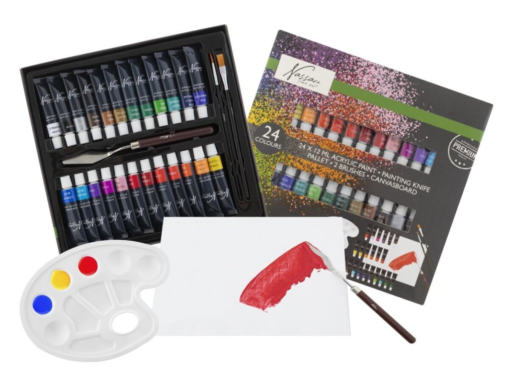 Malířská sada akrylových barev s příslušenstvím. Akrylové barvy 24 ks x 12 ml, paleta, 2 štětce, malířská deska, malířská špachtle. Velikost balení: 26 x 24 x 3 cmObsahuje: Akrylové barvy 24 ks x 12 ml, paletu, 2 štětce, malířskou desku, malířskou špachtli.