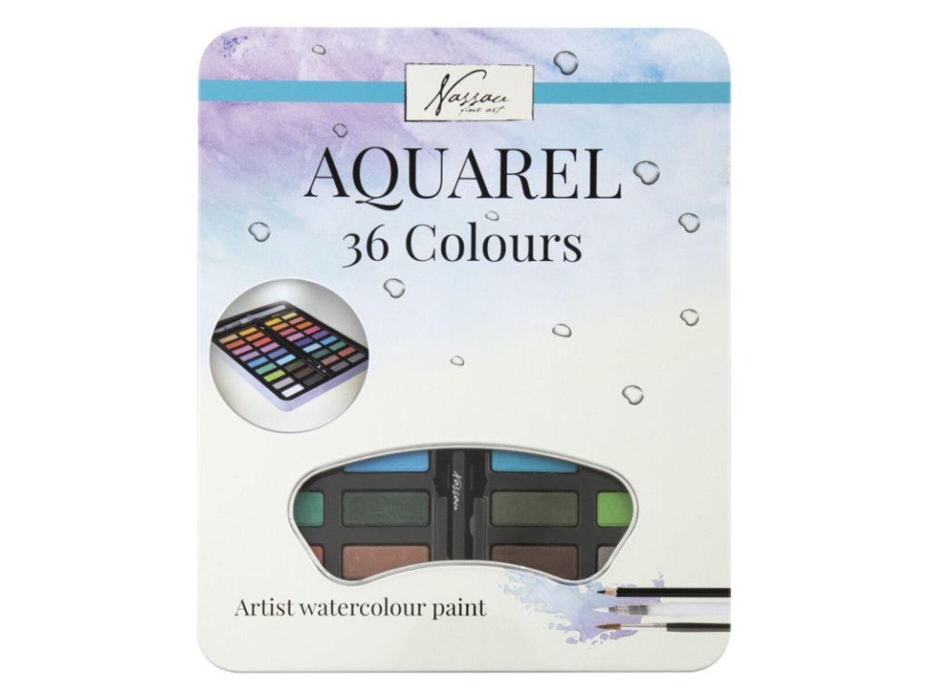 Součástí dodávky je 1x kovové pouzdro s 36 barevnými pigmenty, 1x umělecký štětec, 1x vodní štětec, 1x HB tužka. Promyšlená barevná kombinace v kombinaci s bezzápachovými a kvalitními pigmenty dělá z akvarelové krabičky Nassau Fine Art výbornou volbu, která je navíc překvapivě levná.