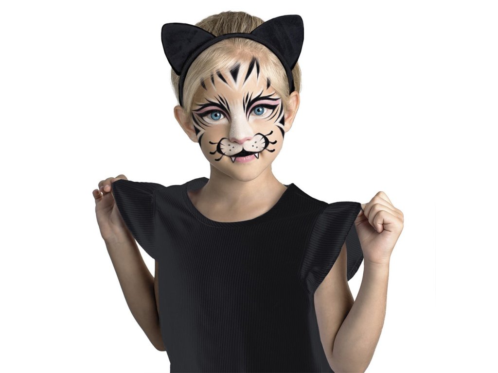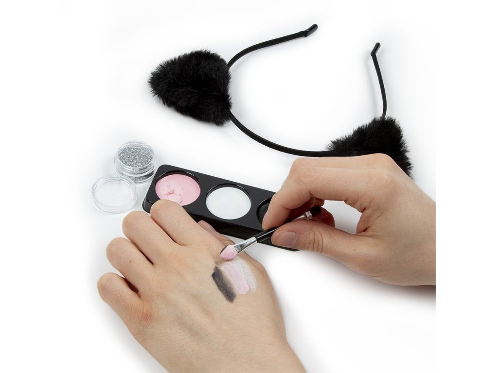 Barvy na obličej s čelenkou s kočičíma ušima. Sada obsahuje tři barvy: černou, růžovou a bílou, stříbrné tělové třpytky a štětec. Sada vám pomůže přeměnit se na kotě ve čtyřech jednoduchých krocích, nebo si můžete pohrát s barvami prostřednictvím originálního stylingu. Tento jedinečný make-up bude ideální pro kostýmní párty, karneval nebo Halloween. Barviva velmi dobře kryjí, snadno se roztírají. Barvy jsou bezpečné pro používání díky laboratorním testům. Rozměry 23,8 x 22,9 x 2 cmDoplňkové parametry
