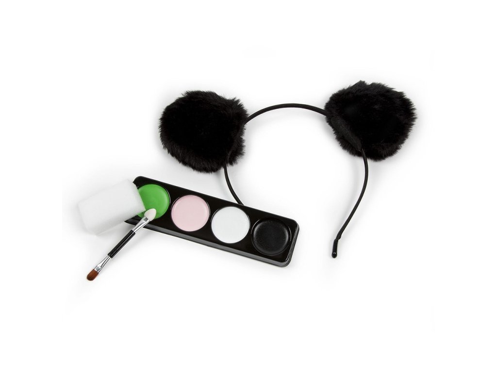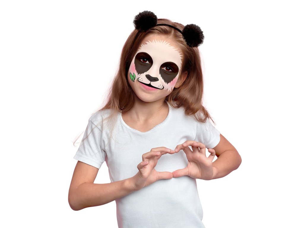 Barvy na obličej s čelenkou ušima pandy. Sada obsahuje barvy ve čtyřech barvách: tyrkysová, růžová, bílá a černá, houbička a štětec. Jen ve čtyřech jednoduchých krocích se můžete přeměnit na roztomilou pandu nebo si vytvořit svůj vlastní. Tento jedinečný make-up bude ideální pro kostýmní párty, karneval nebo Halloween. Barviva velmi dobře kryjí, snadno se roztírají. Barvy jsou bezpečné pro používání díky laboratorním testům. Rozměry 23,8 x 22,9 x 2 cmDoplňkové parametry