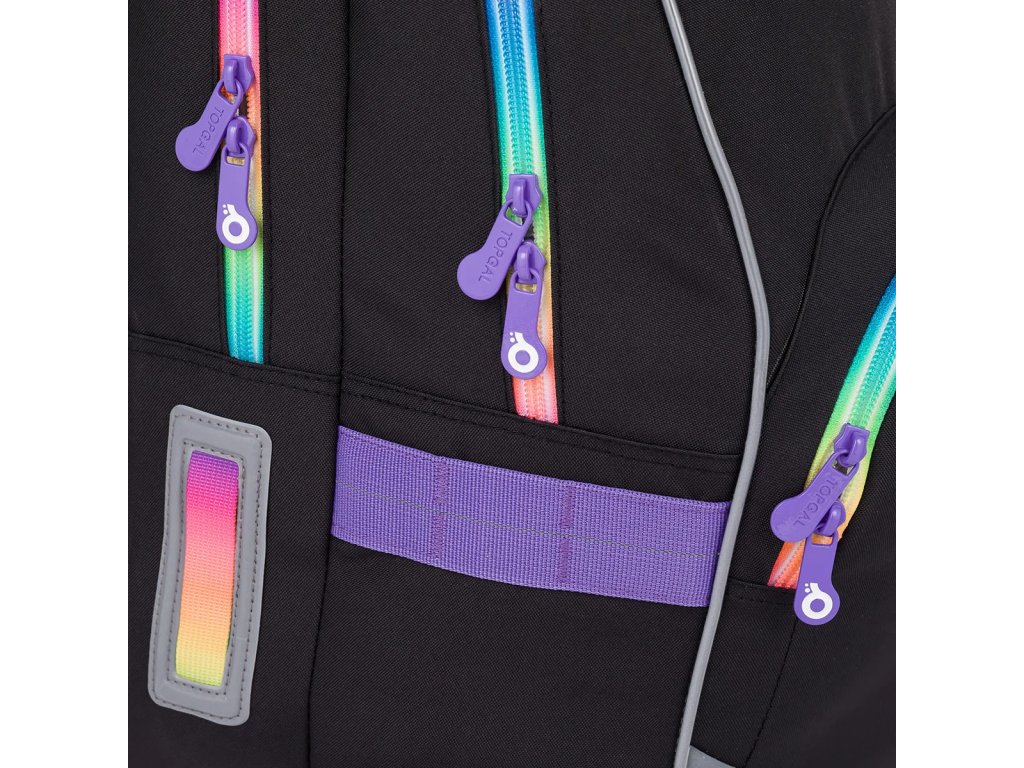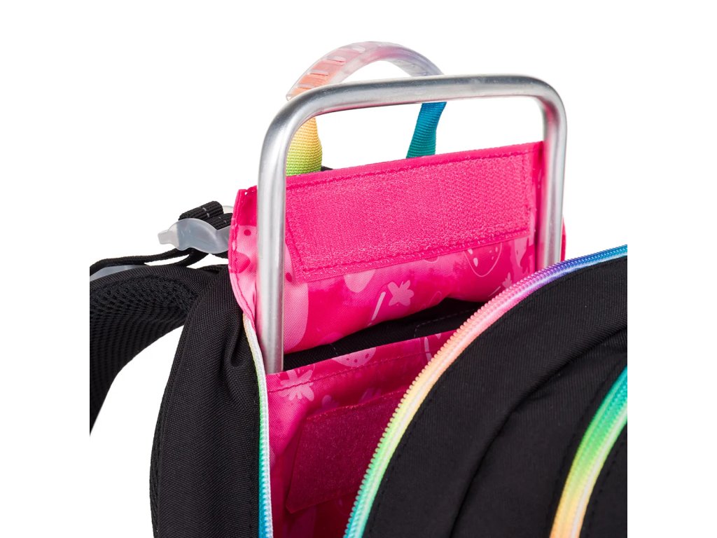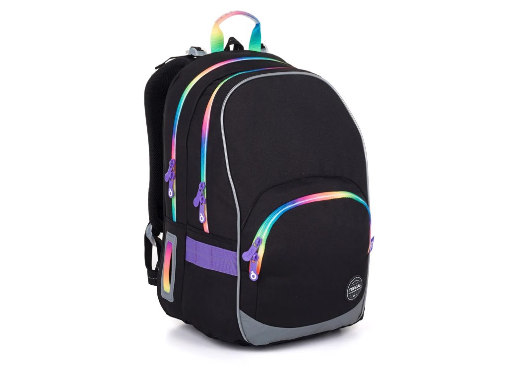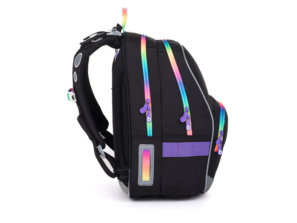 Černý dvoukomorový batoh dobře padne slečnám od 125 cm. Tuto černou klasiku oživí speciální barevné zipy s fialovými taháčky. Kdo se nebojí zaujmout?Dvoukomorový model KIMI jsme letos opravdu vymazlili – černou plochu jsme roztříštili barevnými zipy. A ano, na trhu takových batohů opravdu moc není. ??