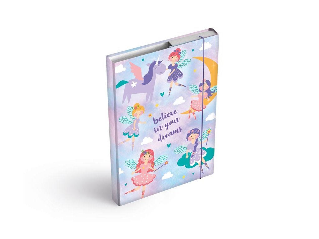 Školní barevné desky na sešity ve velikosti A4 s motivem víl a jednorožce. Jsou nezbytnou součástí vybavení každého školáka. Díky školním deskám budou všechny sešity a učebnice pohromadě a neponičené. Tyto desky na sešity jsou opatřeny gumou, která zabraňuje samovolnému otevření. Heft box je vyroben z kvalitního lepenkového kartonu, potaženého laminem. Z tohoto důvodu se dá velice lehce udržovat.Motiv: víly, jednorožec
