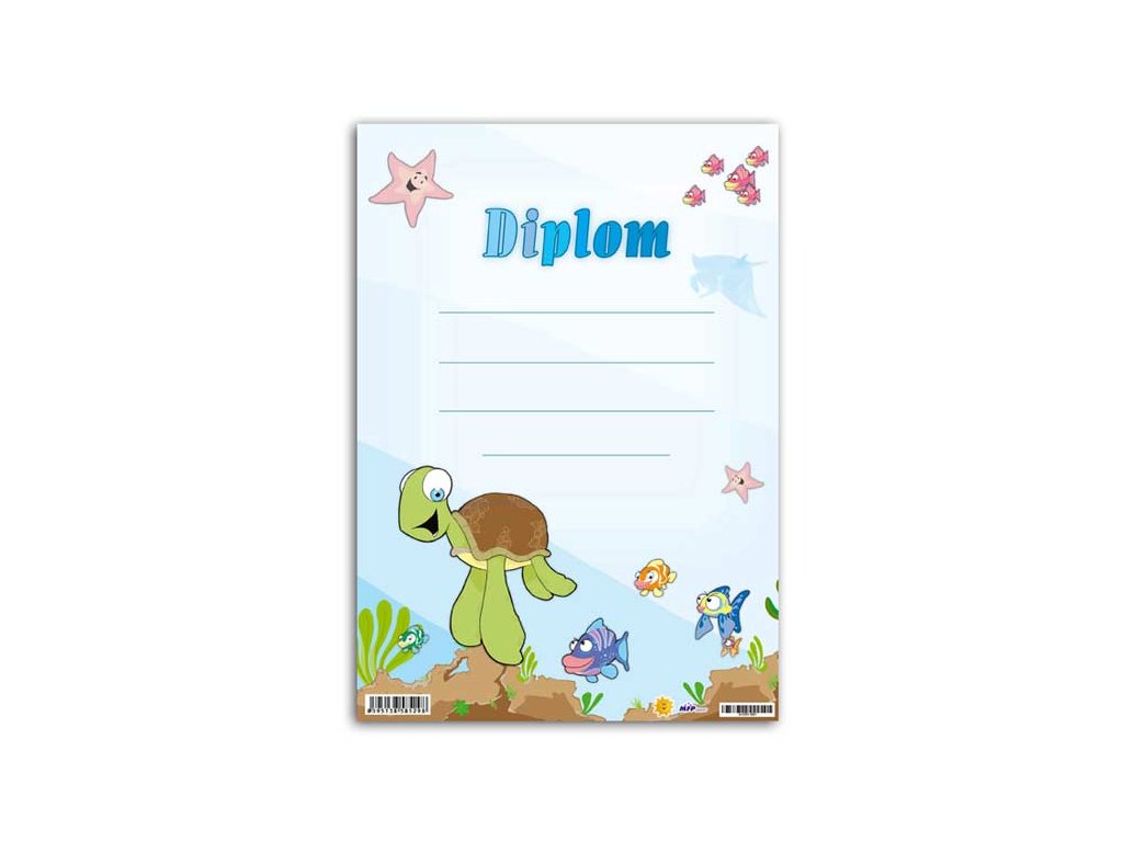 Barevný dětský diplom s obrázkem želvy a rybiček - za každý dosažený úspěch je potřeba dostat písemnou listinu. Určený pro sportovní aktivity, především jako mokré vysvědčení za plavecké kurzy.Diplom obsahuje 4 řádky kam můžete napsat jméno, umístění, za co diplom dostal, popřípadě kdo jej uděluje.