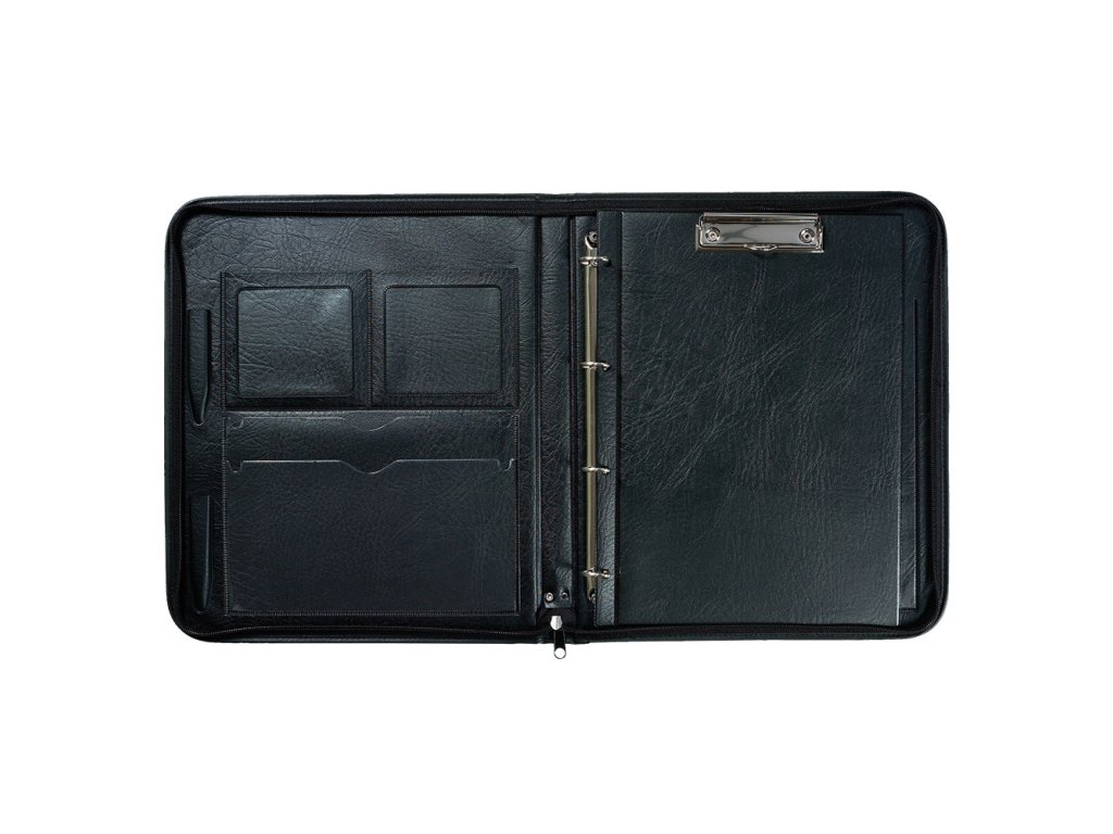 Uzavíratelná na zip, uvnitř kapsy na dokumenty a vizitky, úchytky na psací potřeby, 4kroužková mechanika, jednodeska s klipemDoplňkové parametry