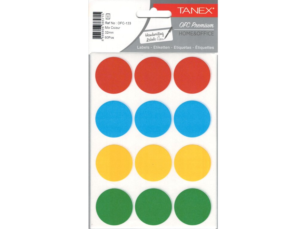 Samolepící etikety v sáčku kolečka 32 mm mix 60 ks OFC-133. Etikety jsou baleny po 5 aršících v sáčku.