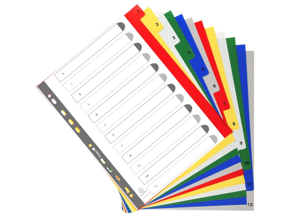 Různobarevné děliče k přehlednému rozlišení dokumentů do pořadačů a desek s černým potiskem číslic 1-12. Měkké a zároveň odolné proti roztržení. Tištěné logo na přední straně. FRůznobarevné děliče k přehlednému rozlišení dokumentů do pořadačů a desek s černým potiskem číslic 1-12. Měkké a zároveň odolné proti roztržení. Tištěné logo na přední straně. Formát A4 maxi umožňuje založit bez přesahu euroobaly, registry aj.pro formát A4 maxi