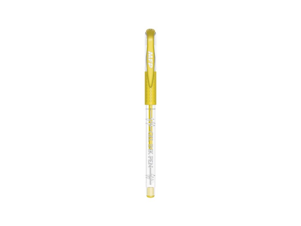 Gelové pero GM1038 s hrotem 0,5 mm. Vhodné pro školní, kancelářské, ale i domácí použití. Gelové pero má pogumovaný úchop, a tak zabraňuje klouzání v ruce.Barva: zlatá