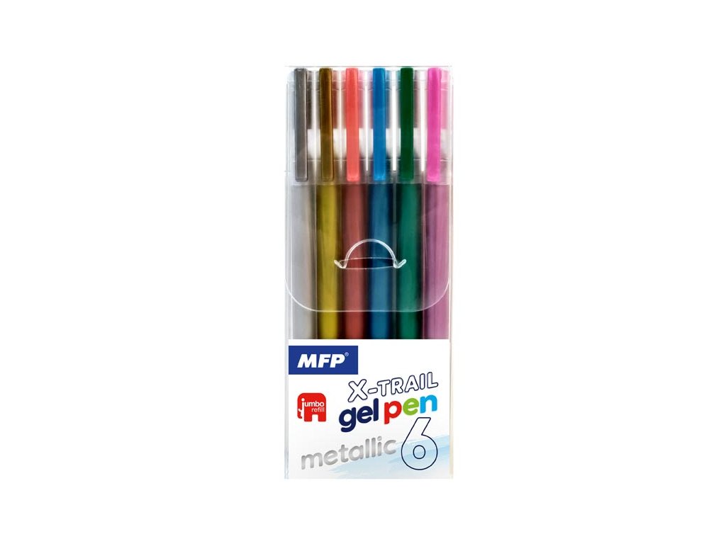 Metalická gelová pera – sada 6 ks – pro psaní a zdobeníHledáte psací potřeby, které dodají vašim poznámkám i kreativním projektům jedinečný vzhled? Sada 6 gelových metalických per přináší elegantní barvy s jemným leskem, které vyniknou na bílém i tmavém papíře.
