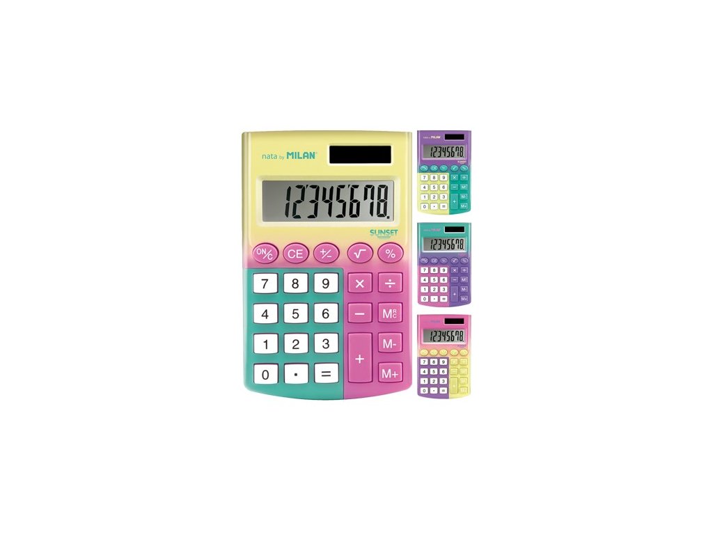 Kapesní kalkulačka 8místná s měkkými gumovými tlačítky. Kalkulačka má duální napájení: 1,5 V baterie + solární panel. Obsahuje funkce: +/-, odmocniny, procenta, krát, děleno, 3 paměťové tlačítka. Design Sunset. Mix barev.Varianta produktu je dodávána podle aktuální skladové dostupnosti.