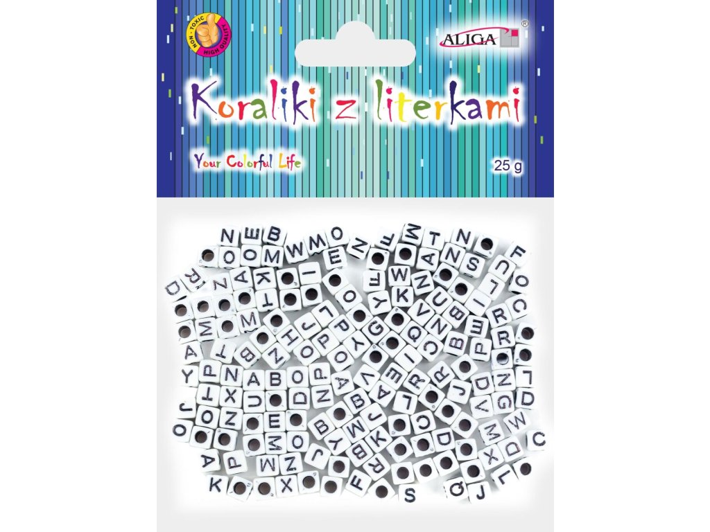 Pytlík 25 g s korálky s potískem písmenek. Korálky 6 x 6 mm. Otvor pro navlékání 3,5 mm. Barva: černo-bílá. UPOZORNĚNÍ: Není vhodné pro děti do 3 let. Obsah malých částí. Nebezpečí udušení. Používejte pod dozorem dospělé osoby.Doplňkové parametry