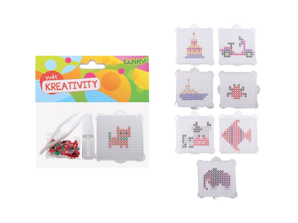 Magické korálky, set. Stačí postříkat vodou a korálky drží u sebe. Různé barvy korálků.- 8 různých motivů: dort, loď, ryba, kravička, pes, slon, beruška, kolo