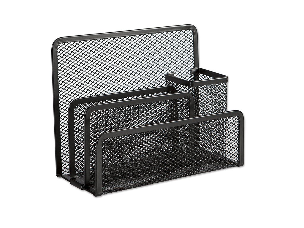Kovový organizér na dopisy a psací potřeby v černé barvě.Rozměry: šířka 17 cm, výška 13,5 cm, hloubka 8,3 cm.