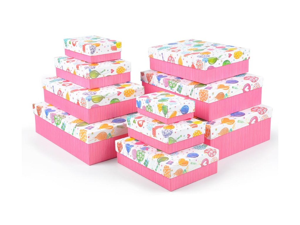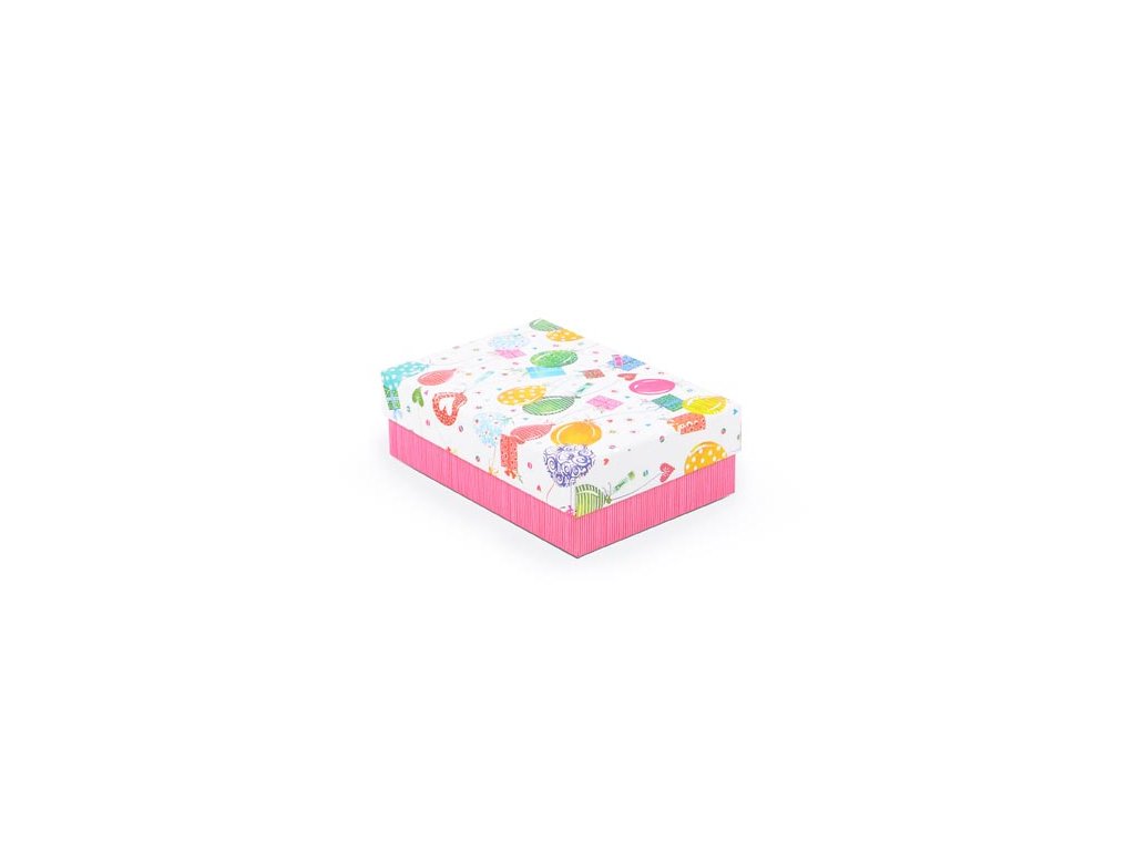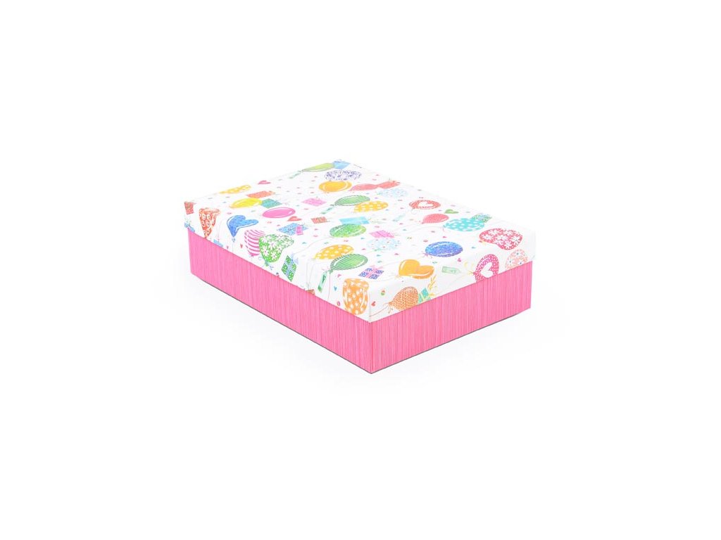 Celoroční dárková krabice.Dárková krabice v živých veselých barvách, kde základem je sytě růžová spodní část a barevně zdobené víko s motivy balónků, dárků, srdíček a dalších slavnostních symbolů. Je ideální pro oslavy jako narozeniny, dětské párty, svátky nebo jakoukoliv jinou příležitost. Díky pevnému materiálu a atraktivnímu designu může krabice sloužit nejen jako obal na dárek, ale i jako praktický úložný box pro pozdější použití, například na hračky, doplňky nebo památeční předměty. Materiál: 1,5 mm karton, potažený papírem s potiskem