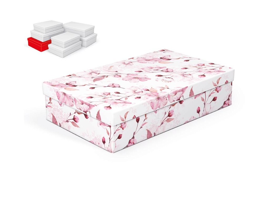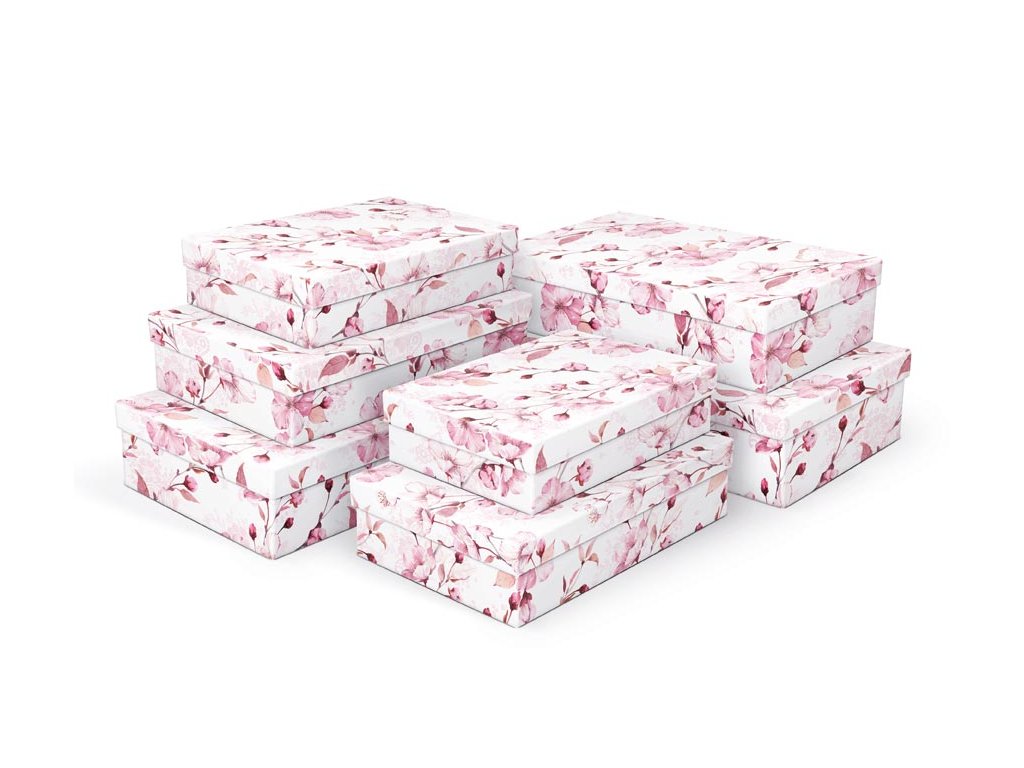 Celoroční dárková krabice o rozměrech 34 x 22 x 8 cmDárková krabice s designem třešňových květů. Vhodná ke slavnostním příležitostem, pro zabalení dárků na oslavy, svatby nebo jen tak, k uschování různých drobností. Dodáváme pouze v setu 7 dárkových krabiček, které jsou ve stejném designu, ale v různých velikostech. Při vložení do košíku se automaticky vloží i ostatní krabičky, tak aby jste měli v košíku vždy celý, kompletní set.