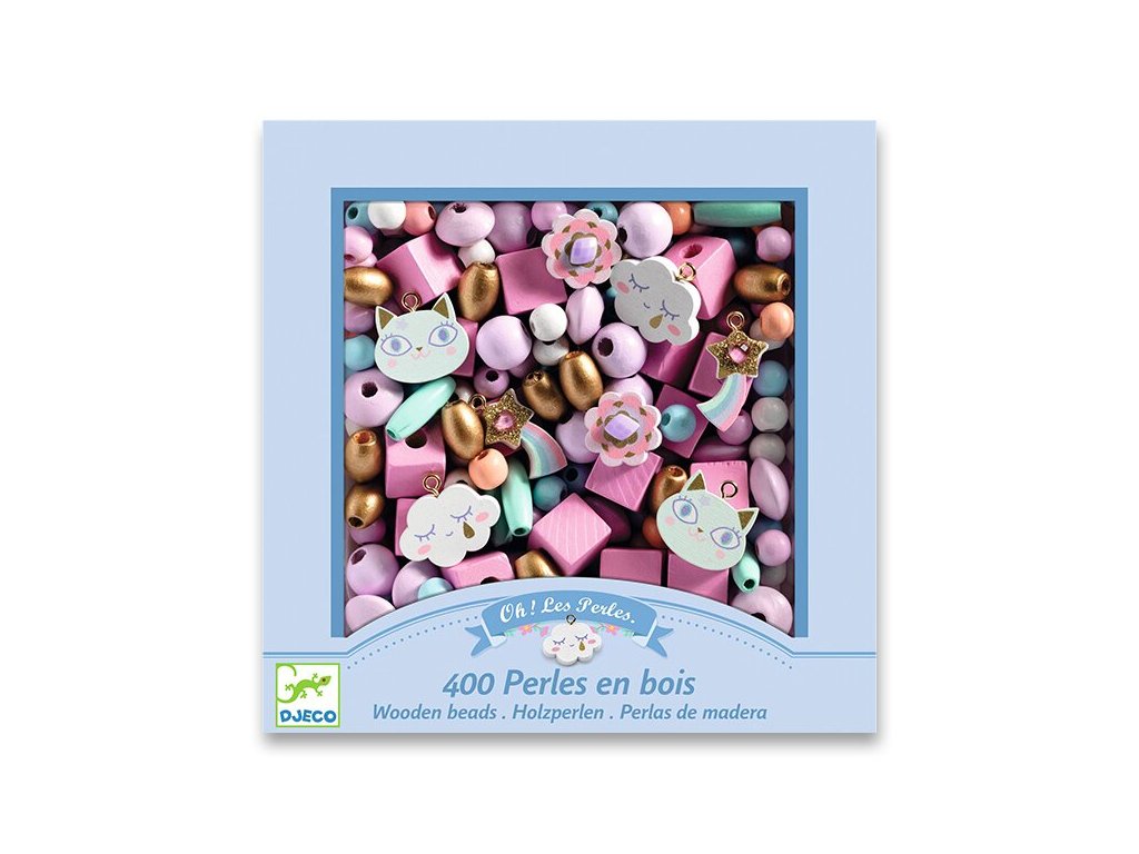 Kreativní sada 450 ks různých druhů dřevěných korálků a přívěsků, ze kterých je snadné navlékat originální šperky.Vhodné od 6 let.