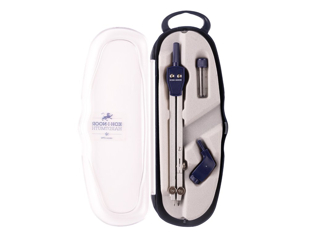 Školní kovové kružítko určené k rýsování kružnic do průměru 360 mm s upínacím průměrem 3,5 mm včetně tuženky s 2 náhradními tuhami a univerzálního nástavce (adaptéru) v krabičce z tvrdého plastu (PS) s eurozávěsem. Dolní část krabičky je tmavě modrá, přední odklápěcí víko je transparentní. Proti náhodnému otevření je krabička kromě zaklapávacího výstupku uprostřed spodního dílu opatřena v místě dotyku horního a dolního dílu rovněž kulatou průhlednou samolepkou..Doplňkové parametry