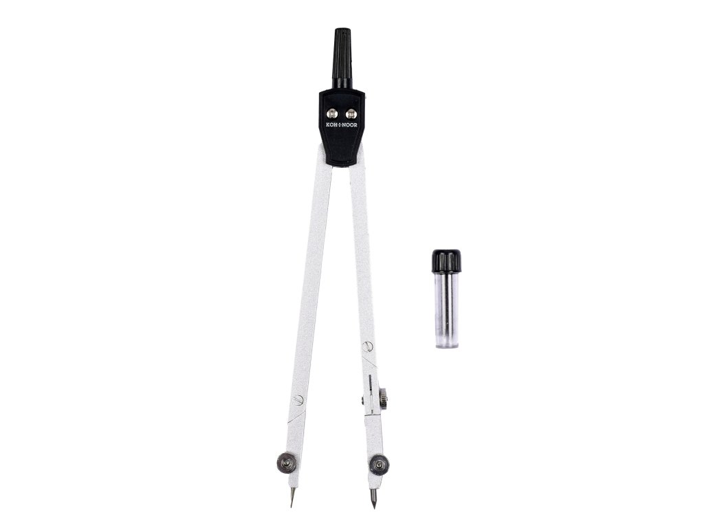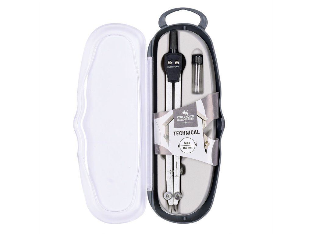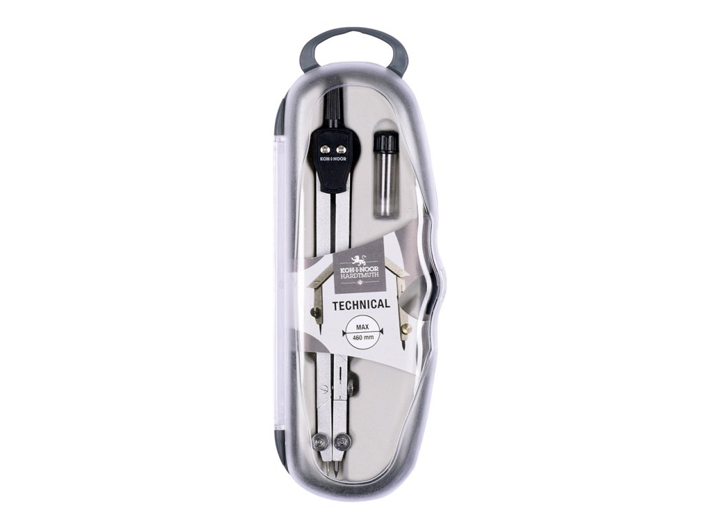 Kovové kružítko k rýsování kružnic až do průměru 460 mm s upínáním o průměru 3,5 mm včetně tuženky s 2 náhradními tuhami v etui s eurozávěsem. Proti náhodnému otevření je etue kromě zaklapávacího zámku v místě dotyku horního a dolního dílu rovněž opatřena kulatou průhlednou samolepkou.Doplňkové parametry