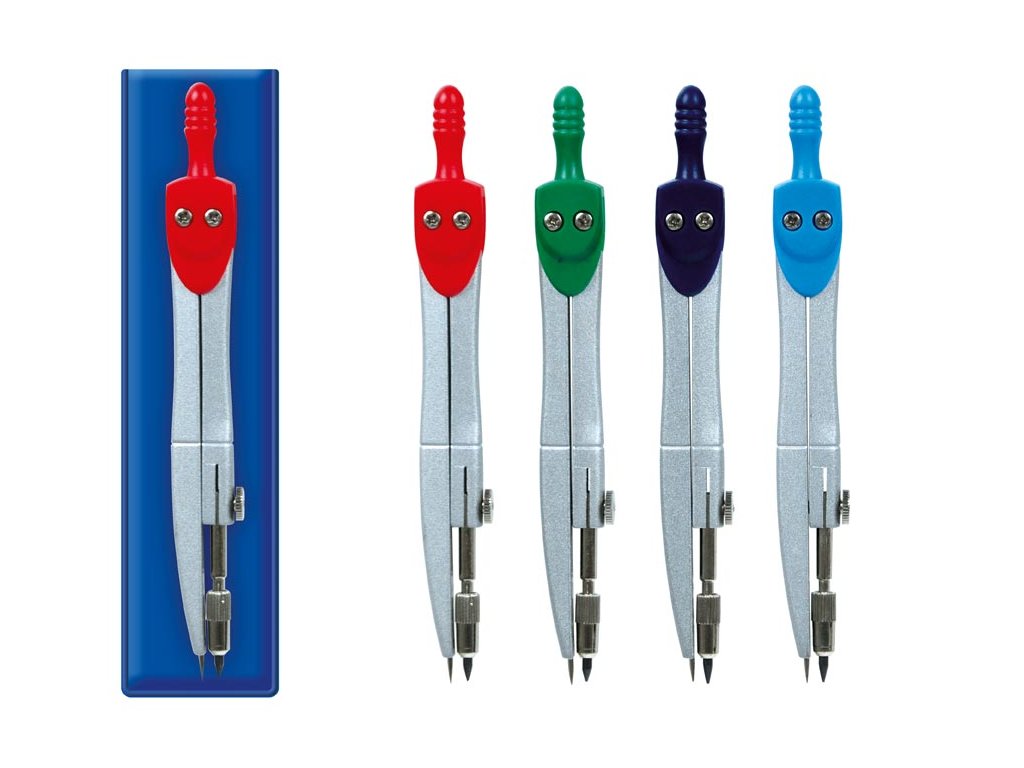 Univerzální kovové kružítko pro kružnice do průměru 34 cm. Kružítko je uloženo v modrém plastovém pouzdru.Délka kružítka: 12 cm