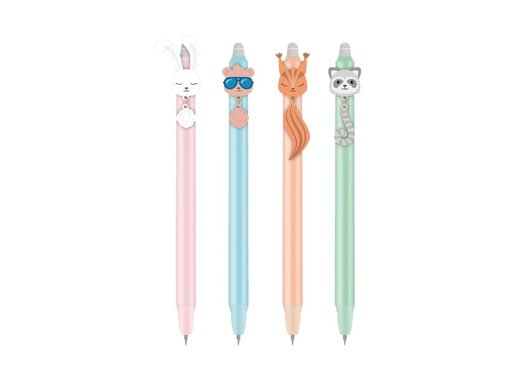 Gumovací kuličkové pero s motivy zvířátek v pastelových barvách. Pero obsahuje speciální inkoust tzv. vymaž a přepiš, nebo vymaž a nech znovu objevit. Pokud uděláte chybu, stačí jen otočit pero a plastovou špičkou text vymažete. Špička zahřeje inkoust, ten zmizí a lze je znovu přepsat. Můžete si psát i tajné vzkazy, po vygumování stačí jen papír ochladit pod bod mrazu a text se znovu objeví. Tato vymazatelná propiska je balena v papírovém stojanu po 20 ks.Náplň: 0,5 mm