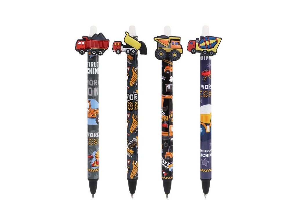 Gumovací kuličkové pero s motivy pracovních aut obsahuje speciální inkoust tzv. vymaž a přepiš, nebo vymaž a nech znovu objevit. Pokud uděláte chybu, stačí jen otočit pero a plastovou špičkou text vymažete. Špička zahřeje inkoust, ten zmizí a lze je znovu přepsat. Můžete si psát i tajné vzkazy, po vygumování stačí jen papír ochladit pod bod mrazu a text se znovu objeví. Tato vymazatelná propiska je balena v papírovém stojanu po 20 ks.Náplň: 0,5 mm