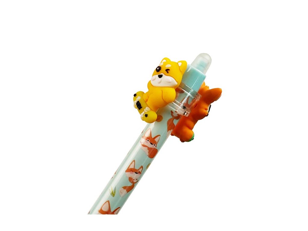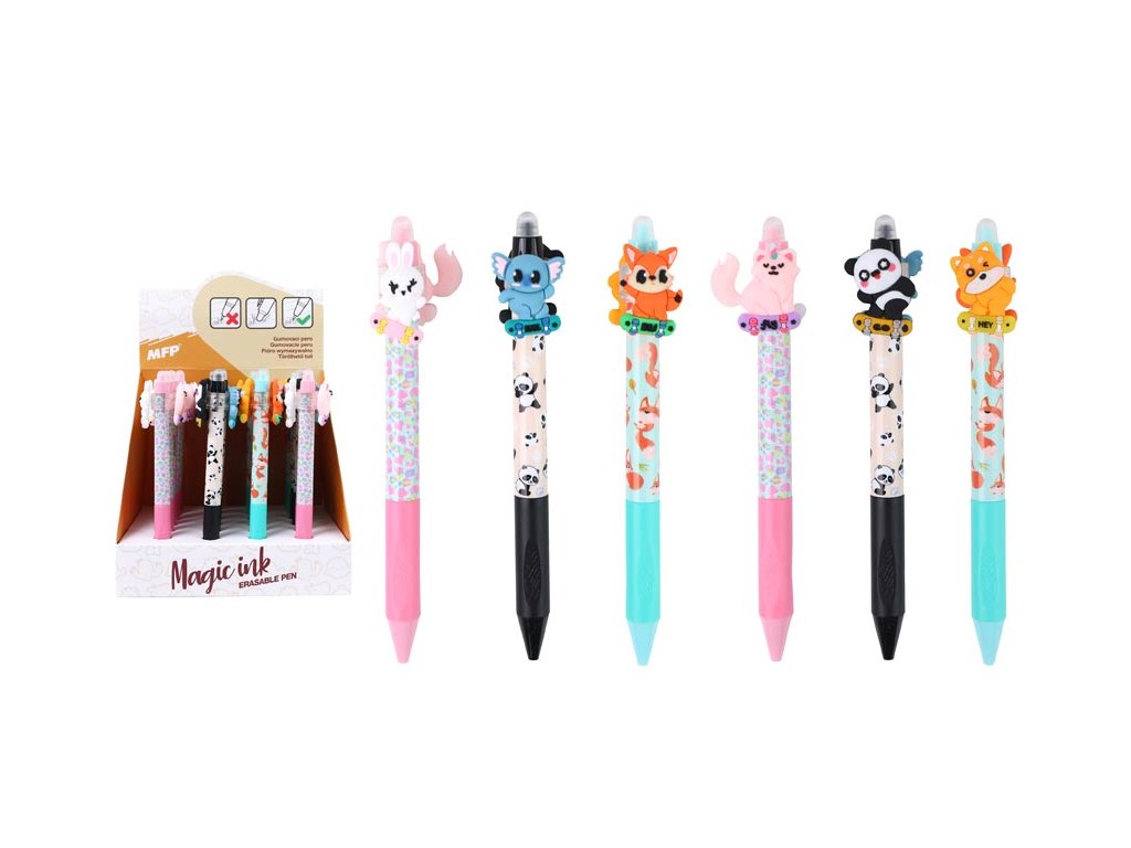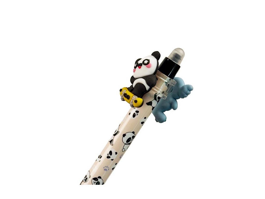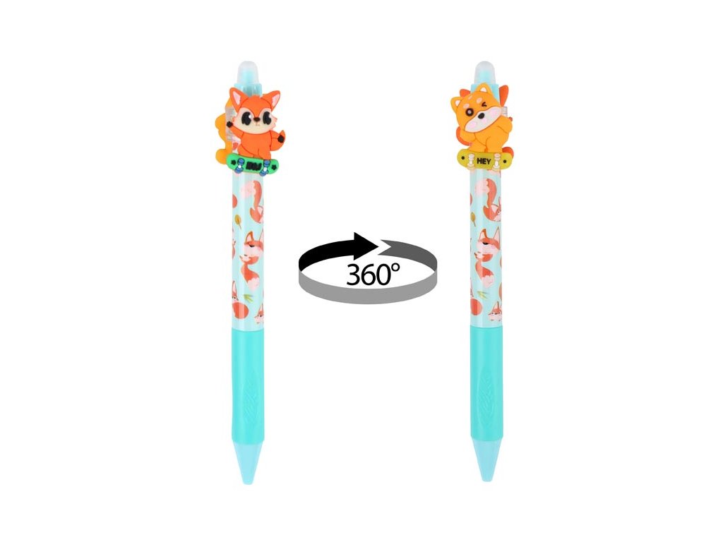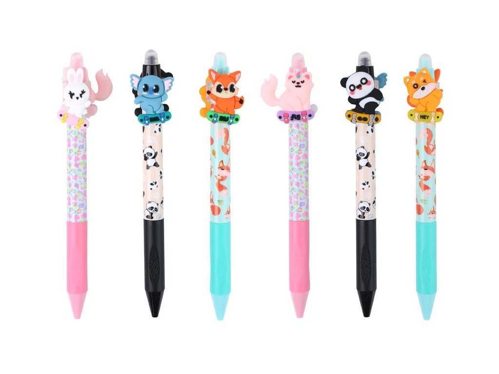 Gumovací kuličkové pero s motivy roztomilých zvířátek. Pero má jemný hrot o tloušťce 0,5 mm a speciální inkoust, který lze snadno vymazat pomocí integrované gumy na konci. Jedinečným prvkem jsou otočné figurky zvířátek umístěné v horní části pera, které dodávají psaní zábavný rozměr. Toto pero je ideální pro školní použití, psaní poznámek nebo tvoření deníčků, kde oceníte možnost opravit chyby bez potřeby korektoru. Kombinace funkčnosti a veselého motivu dělá z tohoto pera zábavný a praktický doplněk do každého penálu.Hrot: 0,5 mm