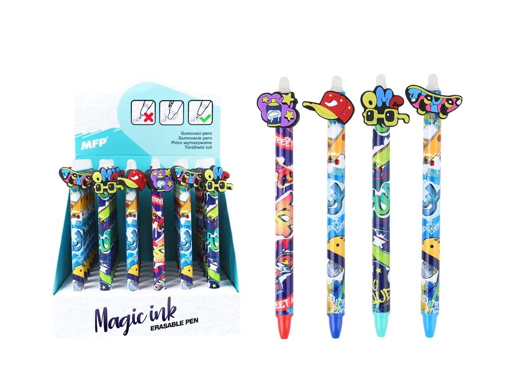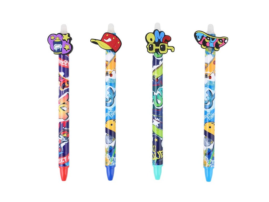 Gumovací kuličkové pero s motivy street art přináší hravý a moderní vzhled inspirovaný pouličním stylem. Každé pero je ozdobeno různými prvky, jako jsou kreslená baseballová čepice, sluneční brýle s nápisem "OMG", graffiti nápis a skateboard. Pero je vybaveno jemným hrotem o tloušťce 0,5 mm a speciálním inkoustem, který lze snadno vymazat pomocí integrované gumy na konci pera. Je ideální pro psaní poznámek, úkolů nebo zápisků do deníčků a plánovačů. Využití najde především ve škole či v kanceláři, kde oceníte možnost snadno opravit chyby bez potřeby korektoru.Hrot: 0,5 mm