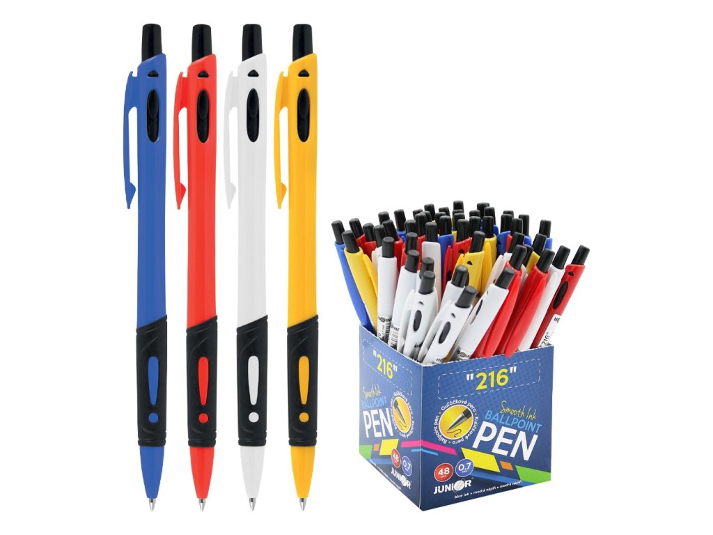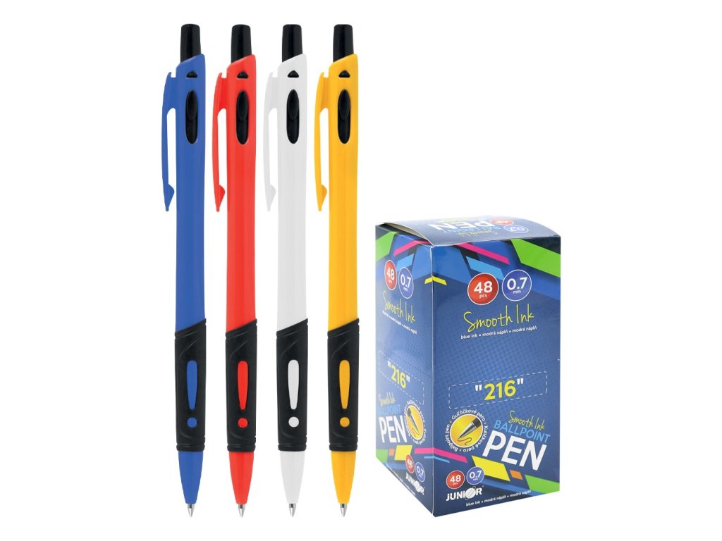 Kuličkové pero s plastovým tělem a ergonomicky tvarovaným gumovým úchopem. Vyměnitelná náplň modré barvy. Dodávané v barvách: modrá, žlutá, červená, bíla.Varianta produktu je dodávána podle aktuální skladové dostupnosti.