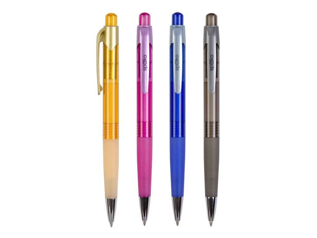 Stiskací kuličkové pero s průhledným tělem, které umožňuje kontrolovat množství náplně. Tělo v kombinaci atraktivně sladěného dvoubarevného designu. Tištěné logo na klipu.mix 4 barev: žlutá, růžová, modrá, hnědá