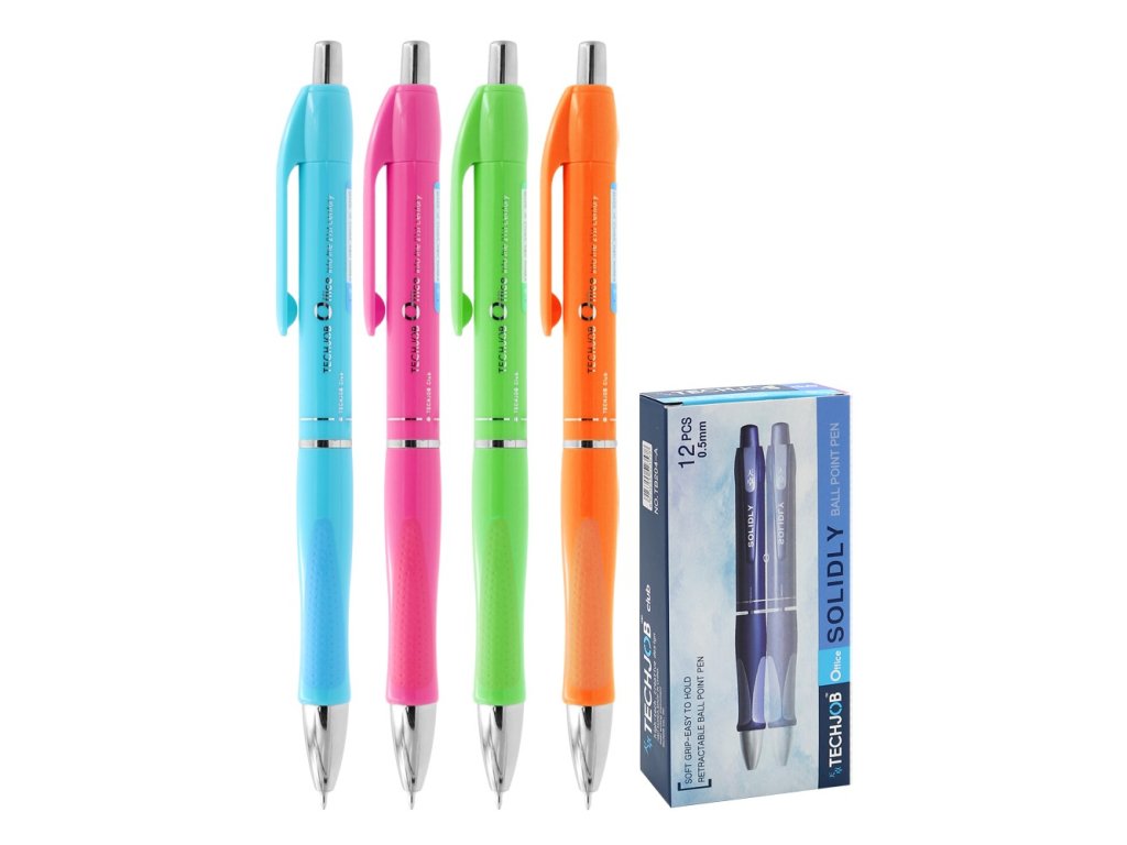 Kuličkové pero se stiskacím mechanismem a mikrohrotem. Plastové tělo s částečně pogumovaným úchopem, pochromované doplňky. Kvalitní hrot 0,5 mm. Modrá náplň. Mix neonových barev.Šíře stopy: 0,3 mm