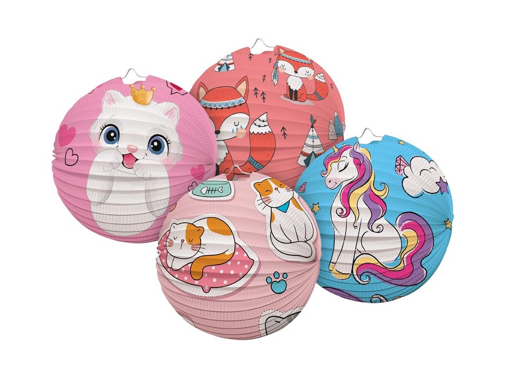 Papírový kulatý lampion barevný s obrázky. Vhodná dekorace na party, lampionový průvod, zahradní slavnost, karneval, oslavu narozenin nebo jen tak na zavěšení do dětského pokojíčku. Vyberte si svůj lampion a udělejte z běžného večera kouzelný.Lampion je z nehořlavého papíru a má držák na svíčku nebo žárovku. Lampion je bez hůlky a světýlka. Lampion má poutko na zavěšení.