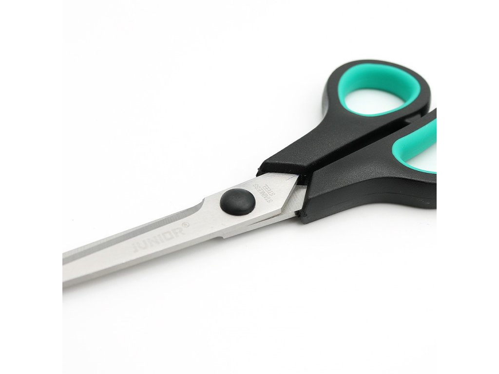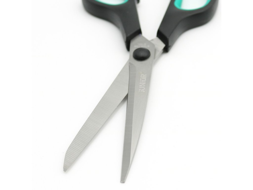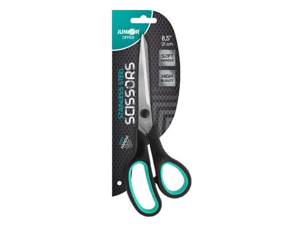 Nůžky s asymetrickými rukojeťmi z PVC v kombinaci so silikonem poskytující kmfortní uchopení. Délka nůžek 20,5 cm, dodávané v černo-červené barevné kombinaci, na blistrui. Rozměr: 210 x 75 mm, 85 mm čepel.Rozměry 210 x 75 mm, 8,5"