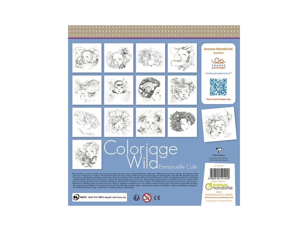 Omalovánky Avenue Mandarine Coloriage Wild z prémiové kolekce určené pro dospělé nebo starší děti. Jednotlivé motivy vychází z poetických ilustrací malířky Emmanuelle Colin a obsahují propracované detaily a náročnější kompozice. Předřezané listy pro případné snadnější vytržení z bloku. Sada obsahuje 28 listů, 14 motivů po 2 ks. Gramáž 250 g. Lze použít na všechny techniky - pastelky, fixy, akvarel atd.Rozměry balení: 20 x 25,5 cm