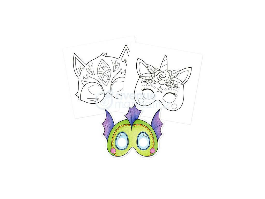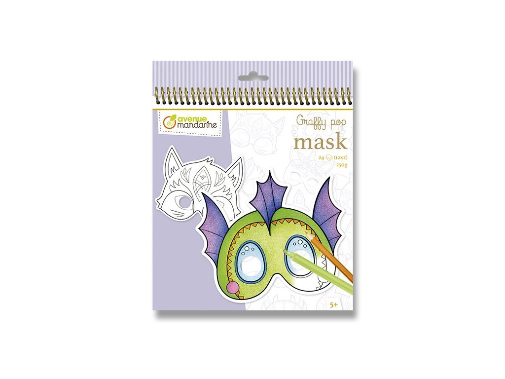Omalovánky Avenue Mandarine Graffy Pop Mask s vyřezanými a předkreslenými motivy masek pohádkových zvířat. Omalovánky obsahují 24 listů, 12 motivů po 2 ks. Gramáž 250 g. Lze použít na všechny techniky - pastelky, fixy, akvarel atd.Vhodné pro děti od 5 let.