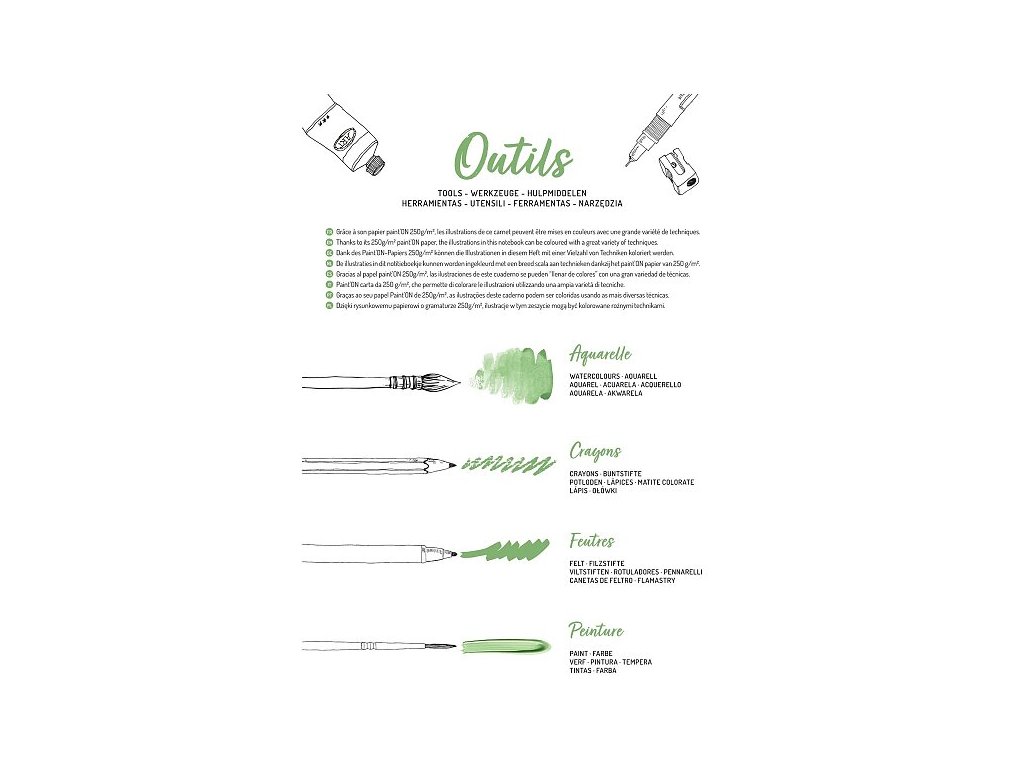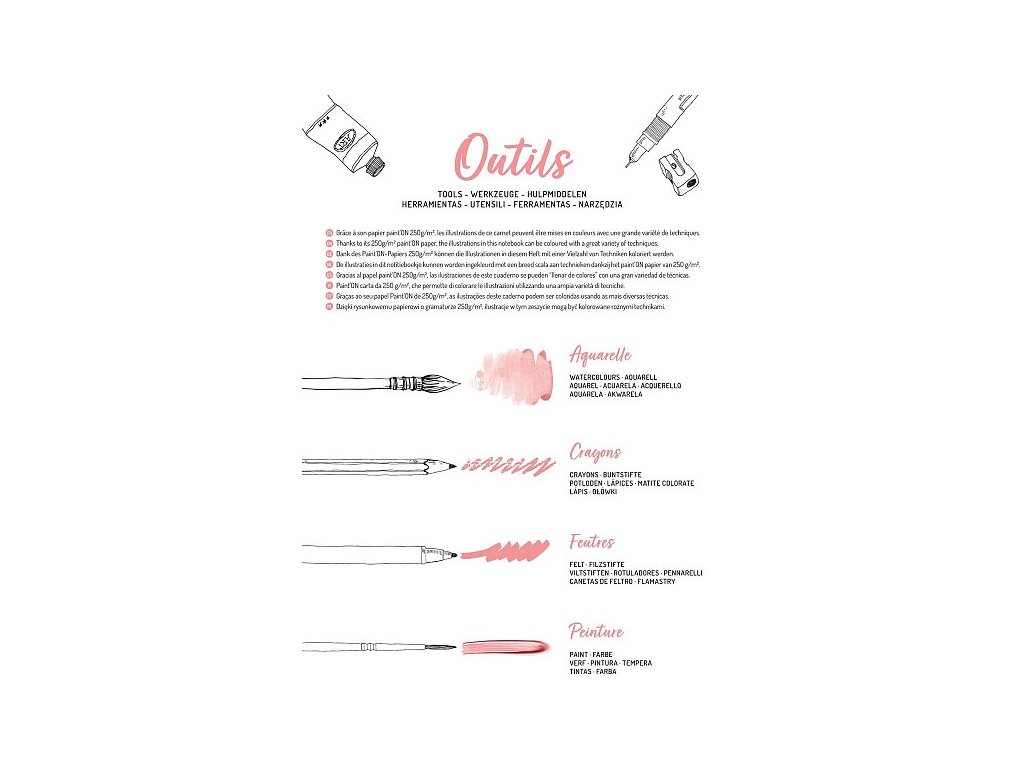 Omalovánky Clairefontaine Odelia Gardens určené pro objevení a vyzkoušení různých technik a stylů barvení. Předřezané listy pro případné snadnější vytržení z bloku.Sada obsahuje: