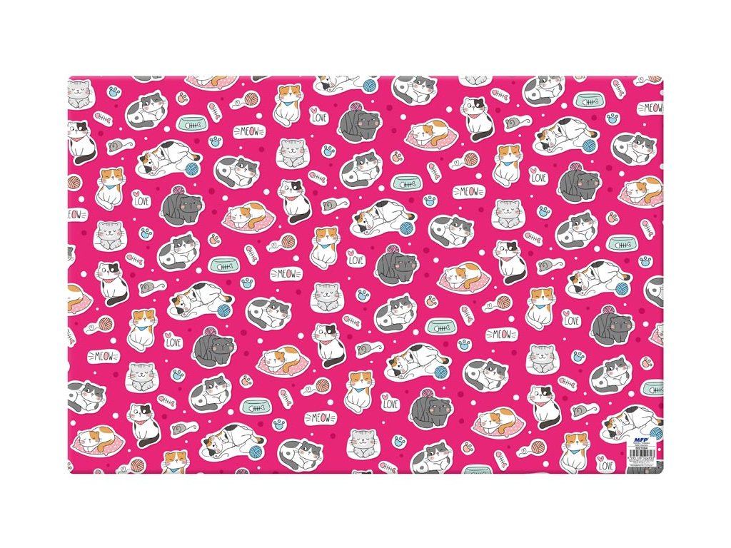 Psací podložka na stůl v růžové barvě s motivem koček. Slouží jako podklad pod kreslení, modelování a jiné tvůrčí činnosti. Chrání nábytek proti poškození a je praktickým pomocníkem školáka. Podložka je vyrobena z papíru, který je zatavený v pevném plastovém obalu.Podložka je velice dobře omývatelná, stačí setřít vlhkým hadříkem. Odolná proti pokreslení pastelkami.