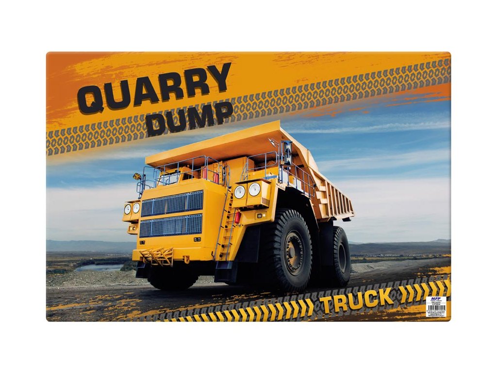 Psací podložka na stůl s obrázkem nákladního auta. Slouží jako podklad pod kreslení, modelování a jiné tvůrčí činnosti. Chrání nábytek proti poškození a je praktickým pomocníkem školáka.Podložka je vyrobena z papíru, který je zatavený v pevném plastovém obalu.