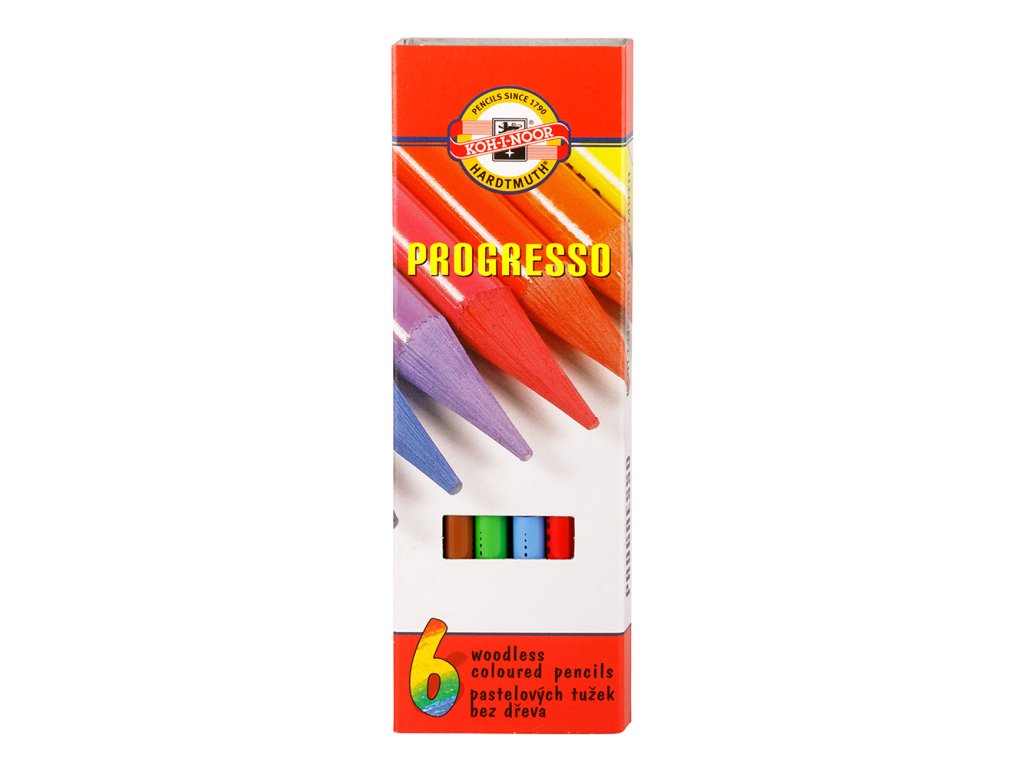Souprava 6 ks pastelových tužek v laku (PROGRESSO). Jsou bez dřevěného pláště a celý průřez je tvořen z pastelovým jádrem. Pastelky se velice dobře hrotí a jsou určeny pro školní, hobby i umělecké kreslení. Vzhledem k svému průřezu jsou vhodné především pro vybarvování velkých ploch.Doplňkové parametry
