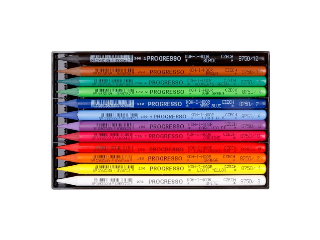 Souprava 12 ks pastelových tužek v laku (PROGRESSO). Jsou bez dřevěného pláště a celý průřez je tvořen pastelovým jádrem. Pastelky se velice dobře hrotí a jsou určeny pro školní, hobby i umělecké kreslení. Vzhledem k svému průřezu jsou vhodné především pro vybarvování velkých ploch.Doplňkové parametry