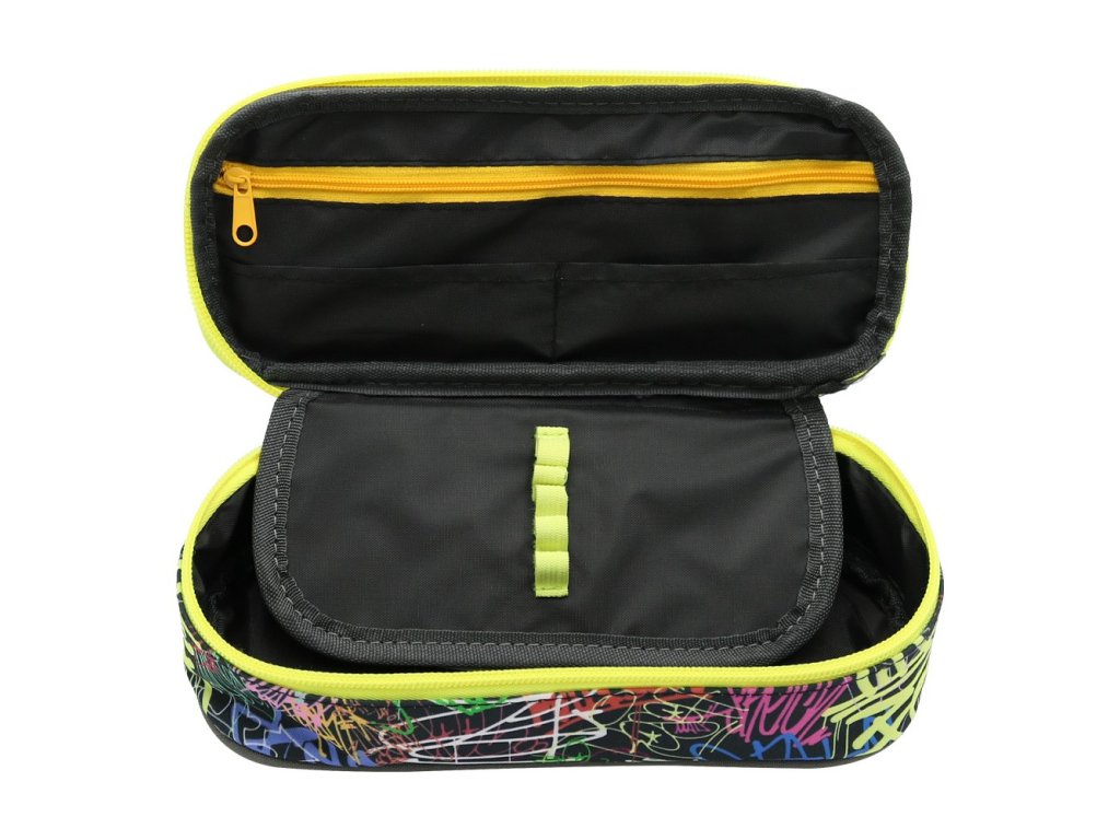 Prostorné 1-zipové pouzdro/penál oválného tvaru obsahuje:chlopeň s poutky na pera a tužky (z obou stran 2x 5 poutek)