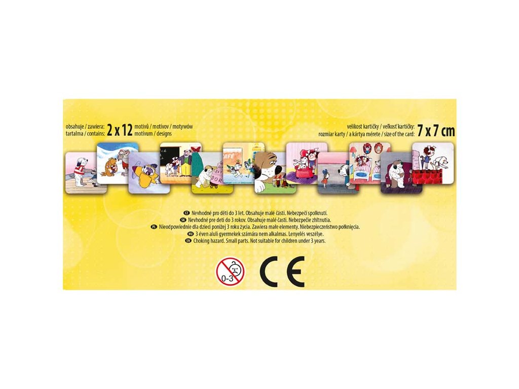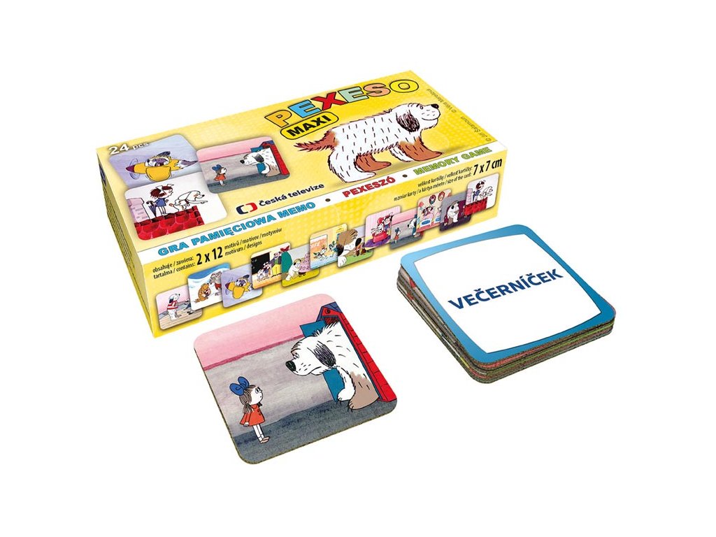 PEXESO je populární dětská stolní hra, která nikdy neomrzí a zapojit se můžou i dospělí. Pexeso - Maxipes Fík + Káťa a Škubánek nás zavede zpět do pohádkového světa ČT. Věděli jste, že slovo PEXESO vzniklo souslovím slov PEKELNĚ SE SOUSTŘEĎ? Výborná učební pomůcka pro děti a rodiče. Naučte své děti poznávat oblíbené české večerníčky a procvičujte jejich paměť. Tato hra je zabaví na dlouhé hodiny.Pexeso se skládá z 2 x 12 vyseklých kartiček pexesa. Tloušťka kartonu je 3 mm, aby jej malé děti mohly lépe uchopit a otočit.