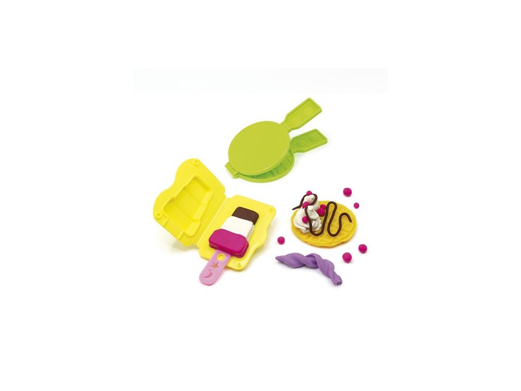 Souprava na modelovaciu hmotu na pšeničném základe "Ice creams & waffles".Obsah aktovky: 6 kelímků po 59 g (bílá, žlutá, oranžová, růžová, fialová a hnědá) a 10 komponentů / nástrojů.