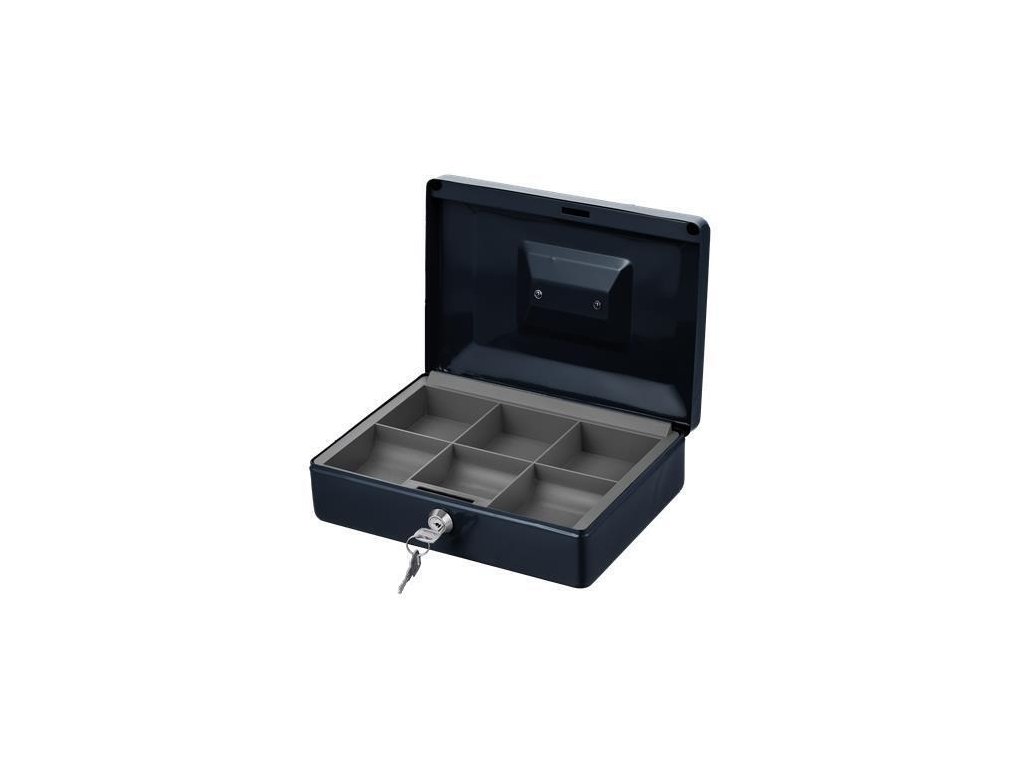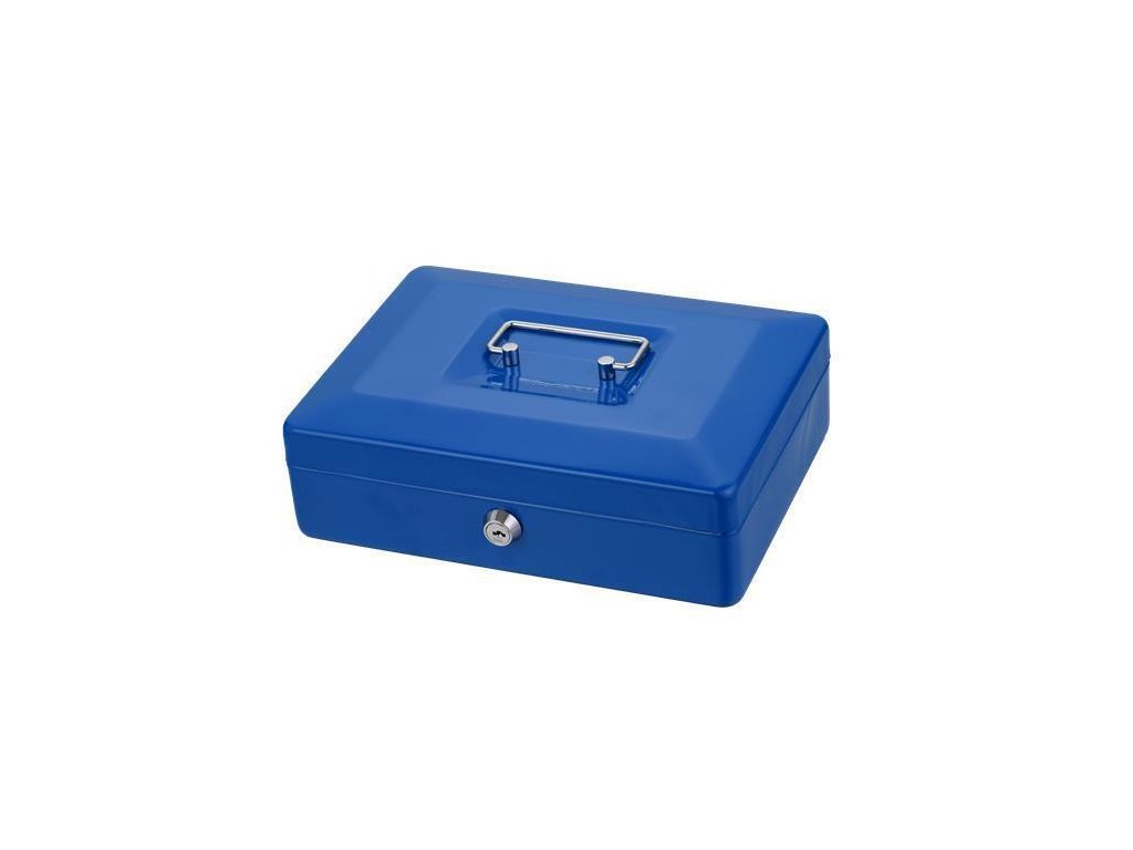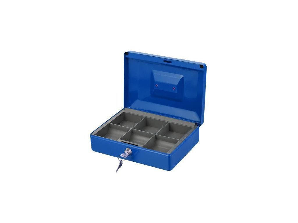 Uzamykatelná, kovová pokladna s rukojetí a přihrádkou na mince.Se zámkem se dvěma klíči