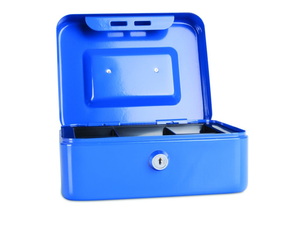 Přenosná kovová pokladnička k uchování bankovek a mincí. Plastovou vaničku na mince lze vyjmout a vkládat bankovky. Oblé okraje pro bezpečnou manipulaci. Úchyt pro snadné přenášení.rozměry: 200 x 160 x 90 mm