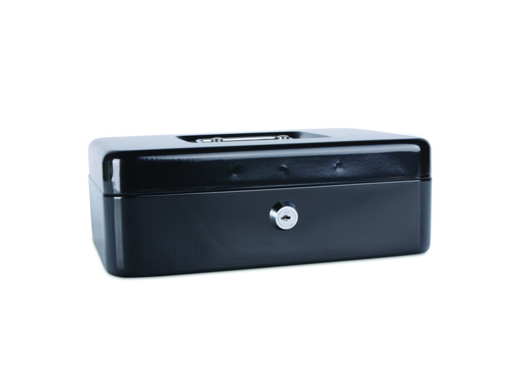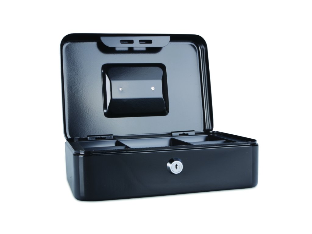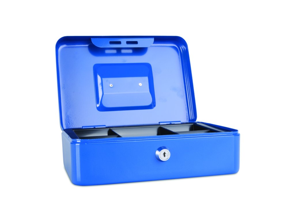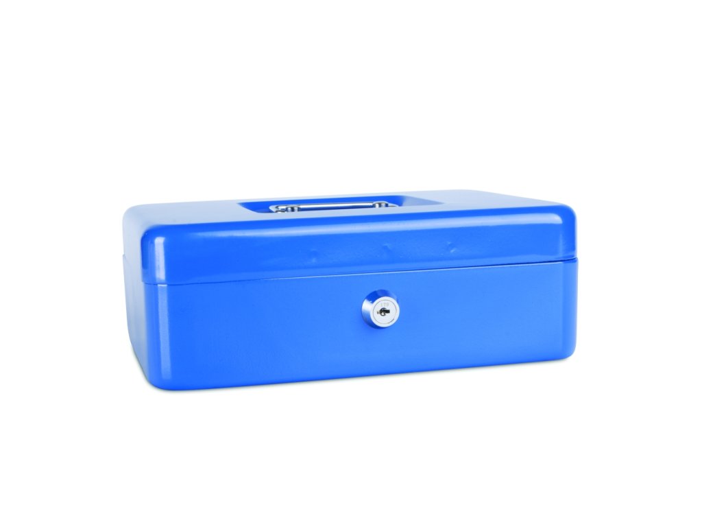 Přenosná kovová pokladnička k uchování bankovek a mincí. Plastovou vaničku na mince lze vyjmout a vkládat bankovky. Oblé okraje pro bezpečnou manipulaci. Úchyt pro snadné přenášení.rozměry: 250 x 180 x 90 mm