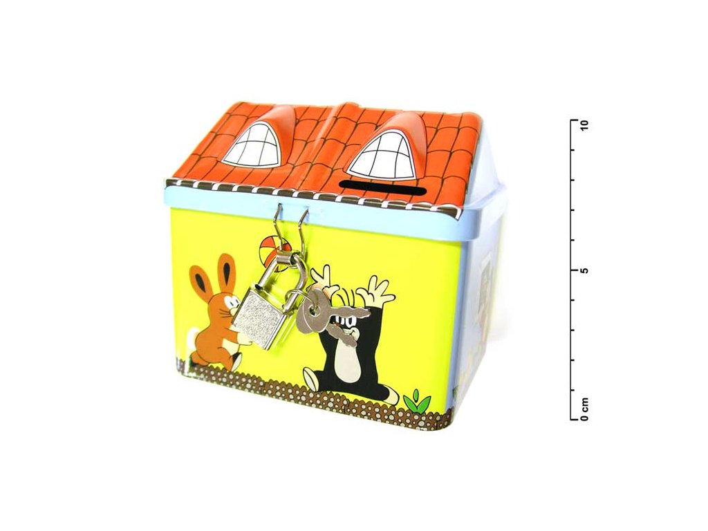 Dětská plechová pokladnička se zámkem s motivem Krtečka - Děti také potřebují mít místo, kam schovají své tajné poklady nebo korunky. Pokladnička s Krtečkem je k tomu jako stvořená!Pokladnička je ve tvaru domečku s motivy krtečka a jeho kamarádů.