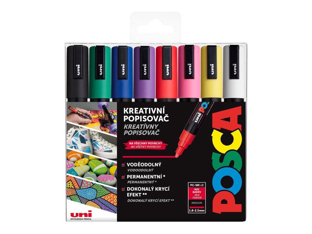 Střední hrot je nejuniverzálnější z celé řady. Poskytuje jasnou a přesnou linku v nejširší paletě barev. Používají ho jak architekti a designéři, tak amatéři při realizaci svých nápadů. Uplatnění najde i v bytovém designu. Díky své univerzálnosti je ideální pro začátečníky, kteří chtějí s POSCA začít tvořit.Sada obsahuje 8 kusů popisovačů PC-5M v základních barvách.