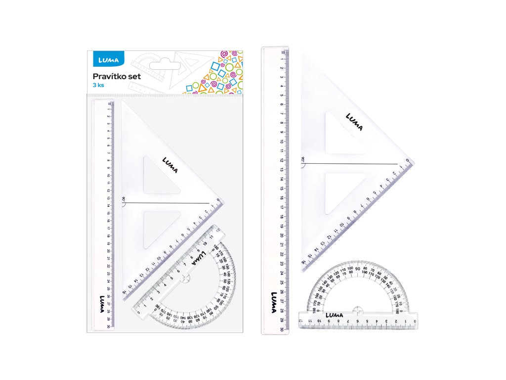 - sada obsahuje pravítko 30 cm, úhloměr, trojúhelník s ryskou