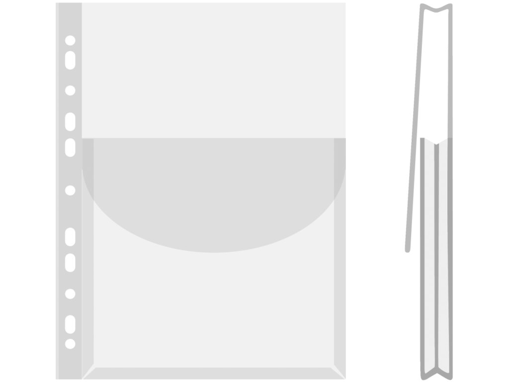 Extra pevný obal tvaru "U" ve formě rozšířené kapsy s dlouhou klopou (21 cm) pro umístění většího objemu dokumentů. Vhodné pro uložení tiskovin ve vyšší gramáži nebo ve větší vazbě (až 27 mm) v základním formátu A4. Kapsu lze založit do pořadače pomocí euroděrování a otevřít díky klopě. Kapsa ve velikosti cca. 2/3 výšky obalu.pro formát A4, otevřený shora