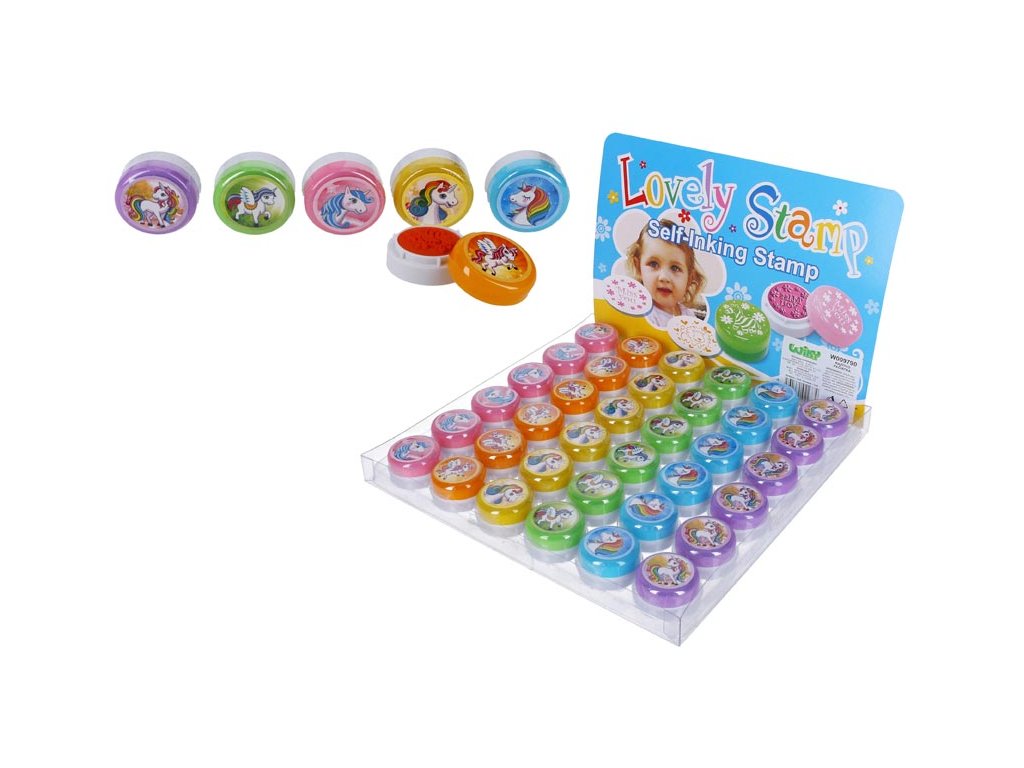 Dětské, samonamáčecí, kulaté razítko z plastu s motivem jednorožce. Nakresli si obrázek a vyzdob ho razítky s jednorožcem!Samotisknoucí razítka s jednorožcem jsou ideální pro všechny kreativní děti, které si rády malují! Na předním obalu je vždy vyobrazen určitý jednorožec. Razítka jsou v různých barvách.