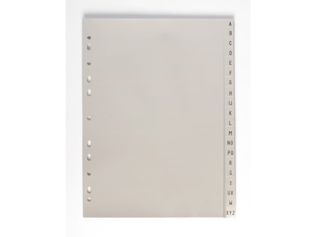 Rozdružovač, rozlišovač nebo rejstřík. Praktická pomůcka pro oddělování dokumentů, rejstřík A-Z, formát A4, šedá barva. Vhodné k zavěšení do pořadače. Polypropylen, síla 120myDoplňkové parametry